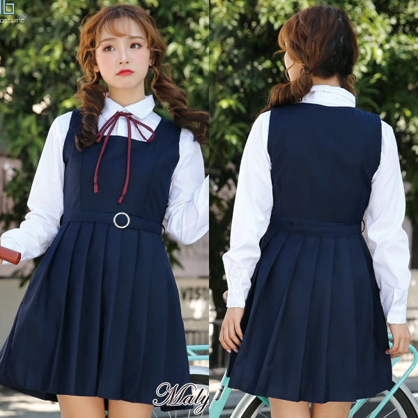 あどけなさを残しつつも、ウエストマークした程よい丈感のジャンパースカートで上品に魅せる♪トップスやワンピース、リボンとベルトが付いた女学生風の制服コスプレ4点セット。
